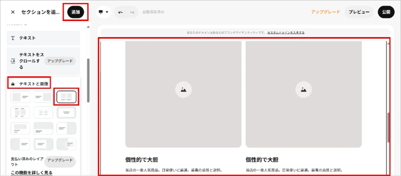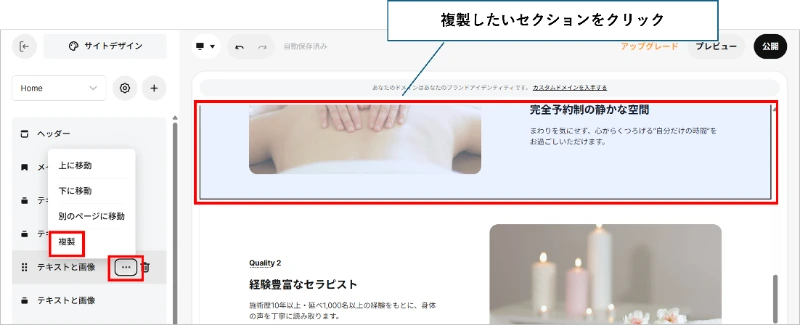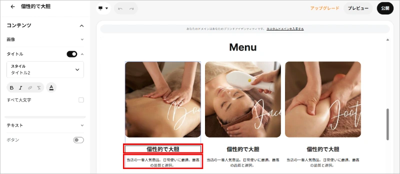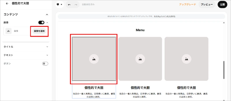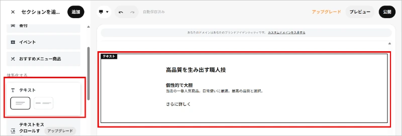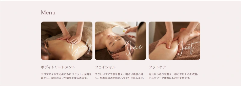 メニューページは、トップページと同様に、「画像とテキスト」「テキスト」「ボタン」セクションで作成しています。
