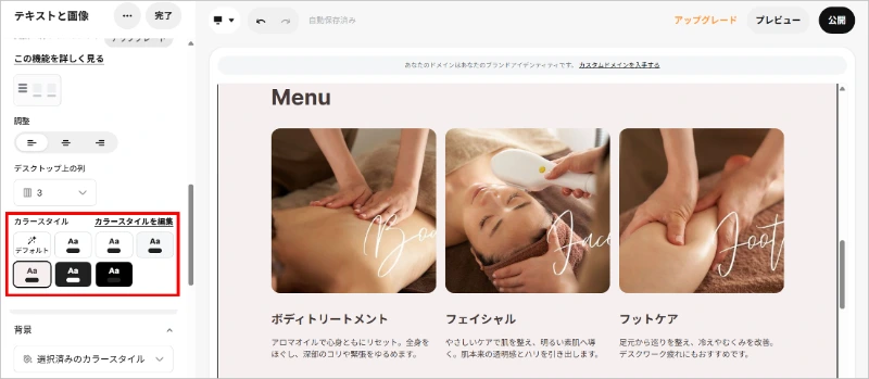 新しいサイトスタイルを選択すると、現在設定されているデザインがまるごと変更になるのでご注意ください。