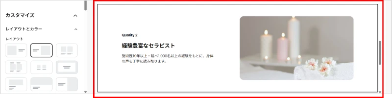 • 初心者に優しい操作感 決められた枠組みに要素を当てはめていくスタイルなので、デザインに自信がない初心者の方でも進めやすいサービスだと感じます。
