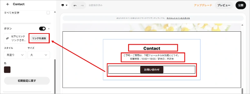 この設定で、ボタンを押すと「お問い合わせ」ページに移動するようになります。