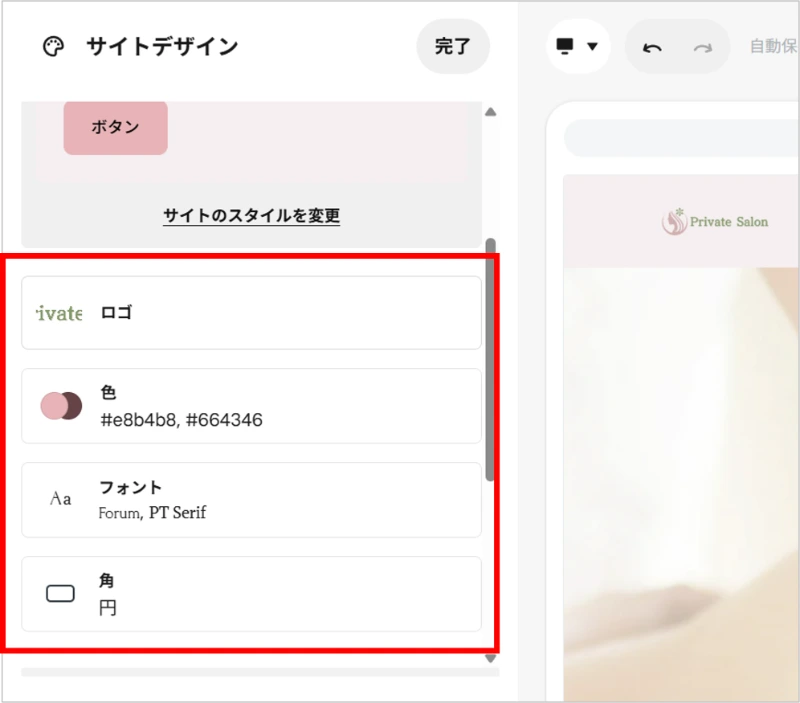 サイトデザインでは、色や見出しのフォントなど、ホームページ全体の雰囲気を変更することができます。