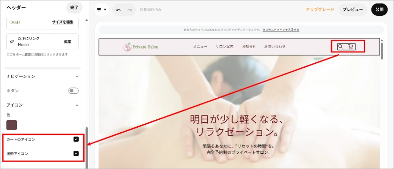[カートのアイコン][検索アイコン]のチェクをオフにすると、非表示になります。