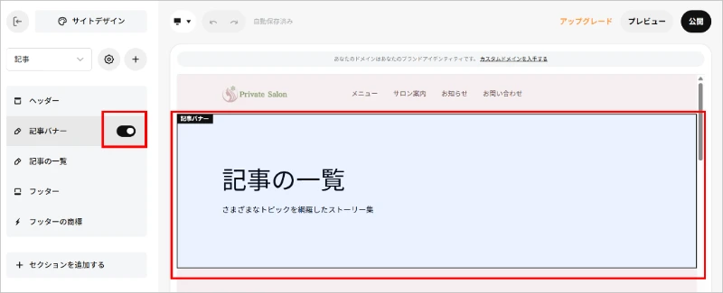 ②記事一覧ページがが表示されるので、必要であれば、記事バナーを設定しましょう。