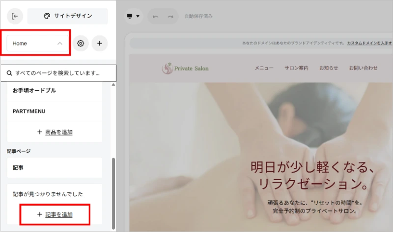 Squareでホームページ作成|[HOME]→[ページを追加する]
