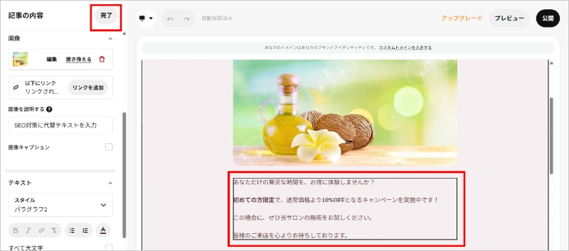 ④画像下に、テキストを入力し、最後に[完了]をクリックします。