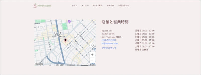 サロン案内(店舗情報・アクセス)ページには、テンポの所在地や営業時間、アクセスマップを表示することができます。
