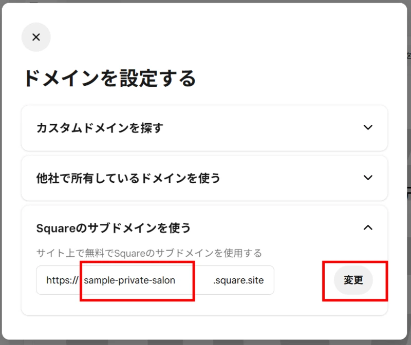 ②「https://〇〇〇 square.site」 の「〇〇〇」部分に、お好きなドメインを入力し、[変更]をクリックします。