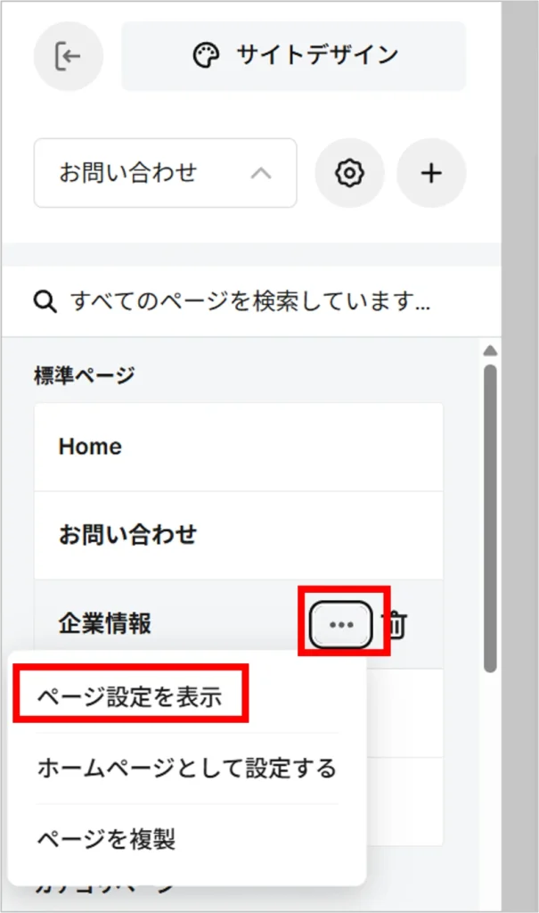 [企業情報]の[…]をクリック→[ページ設定を表示]をクリックします。