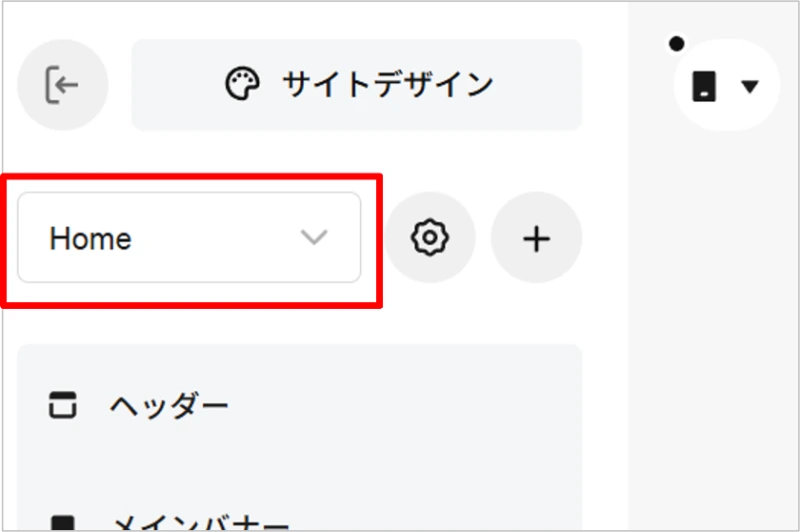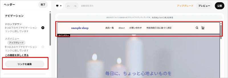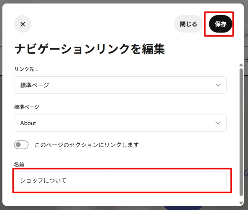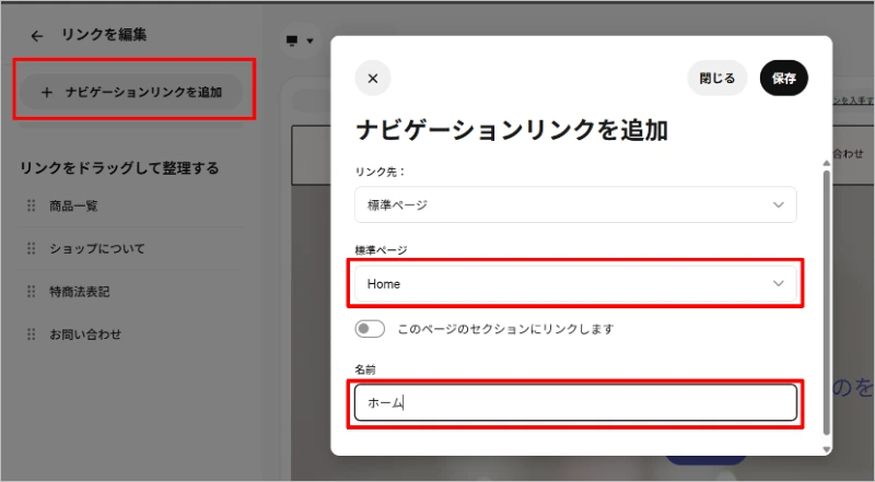 ⑤[ナビゲーションリンクを追加]で、表示の追加ができます。例として、ここでは[ホーム]を追加しています。