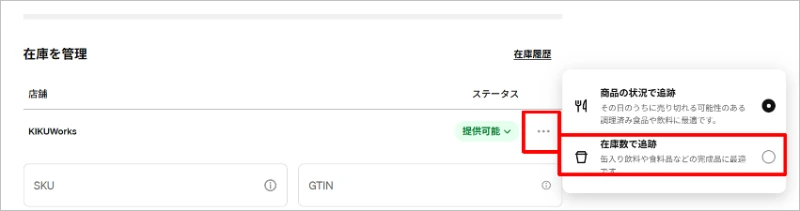 ①ステータス下の[…]をクリックし、[在庫数で追跡]をクリックします。