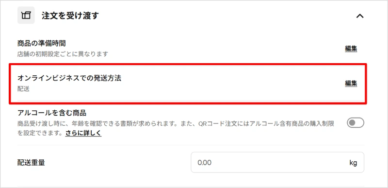 [編集]をクリックすると、オンラインビジネスでのお届け方法を編集できます。