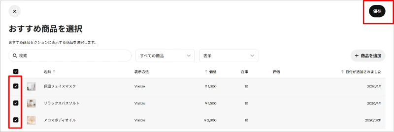 ②販売したい商品にチェックをし、[保存]をクリックします。