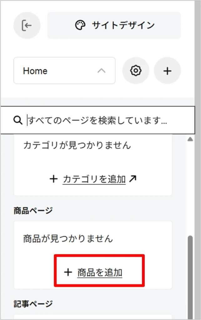 ②メニューから[商品ページ]の[商品を追加]をクリックします。