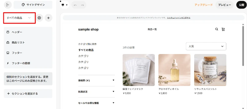 無料プランを選択すると、サイトのデザインページが開きます。ここから、商品追加ページへ移動します。