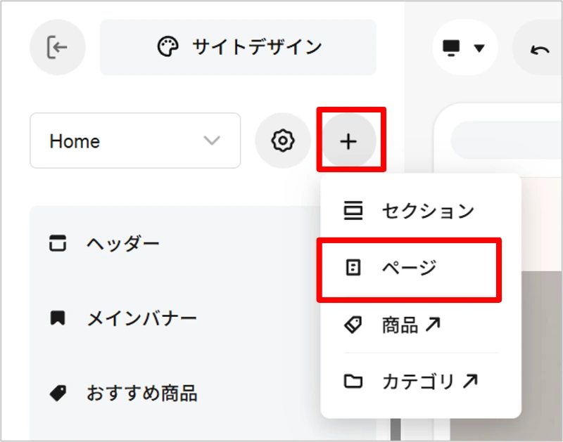 ①左メニューの、[+]→[ページ]の順にクリックします。