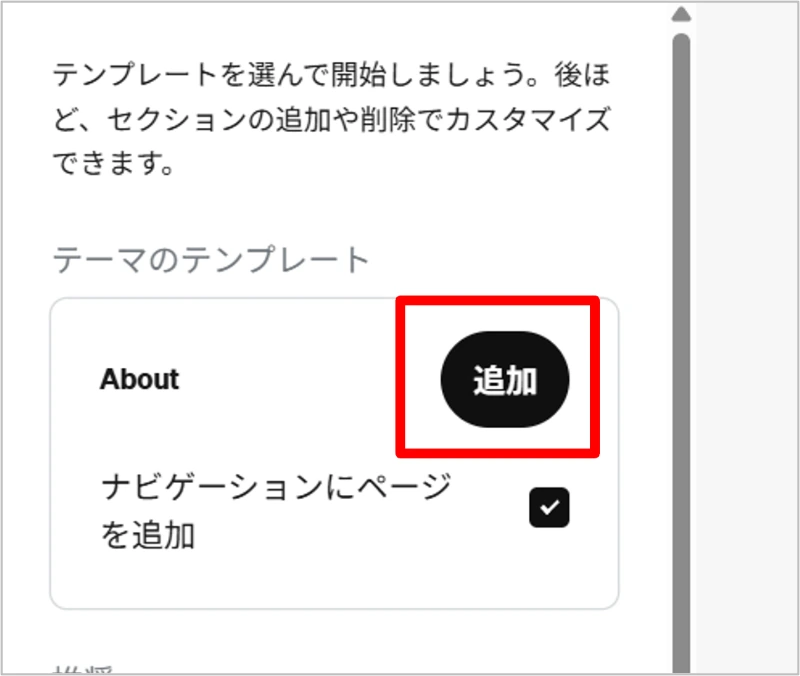 ②テーマのテンプレートの[About]→[追加]の順にクリックします。