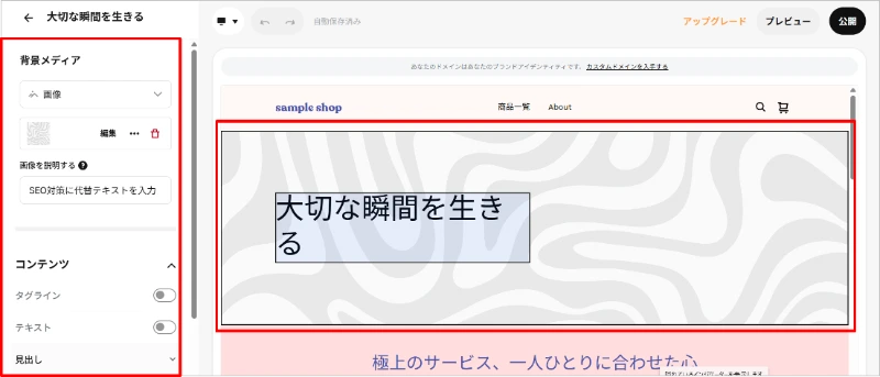 ③編集したい個所をクリックすると、左にメニューが表示されるので、お好みで編集しましょう。