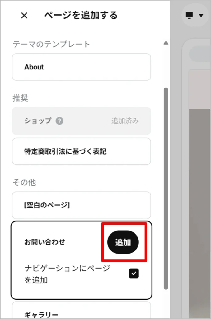 ①左メニューの、[+]→[ページ]→[お問い合わせ]→[追加]の順にクリックします。