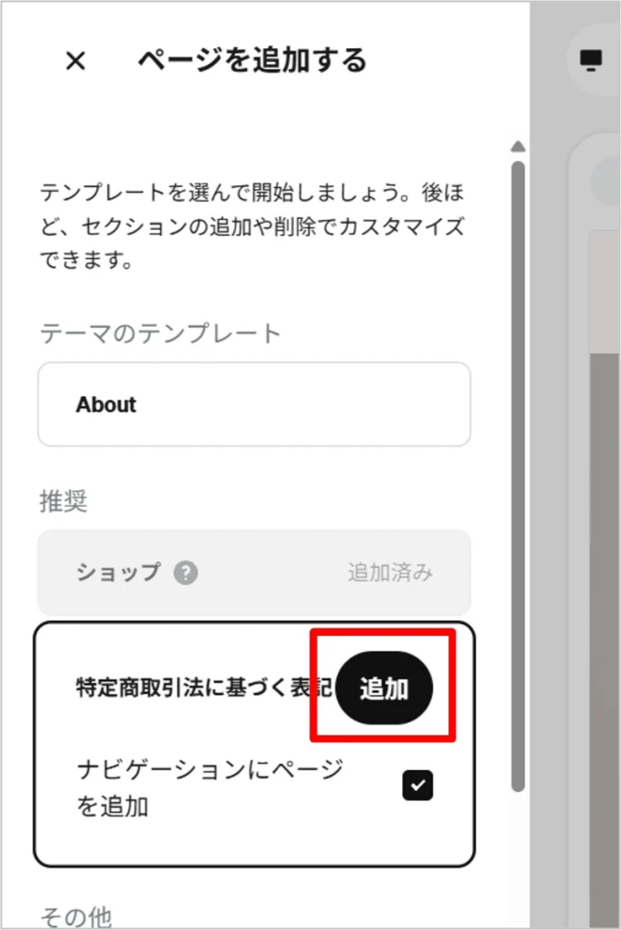 ①左メニューの、[+]→[ページ]→[特定商取引法に基づく表記]→[追加]の順にクリックします。