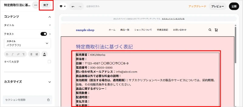 - 特定商取引法に基づく表記:あらかじめ用意されているページを活用