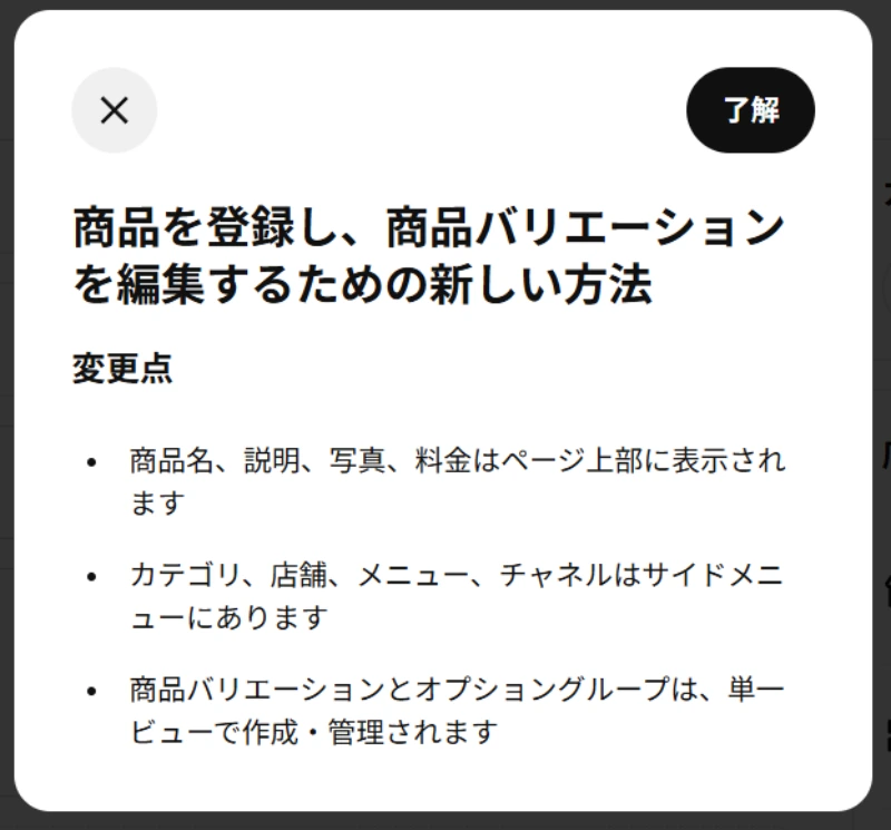 下の画像のようなポップアップが表示された場合は、「商品登録画面のレイアウトが変わりました」という案内なので、内容を読んだら 「了解」 で閉じて進んでOK です。