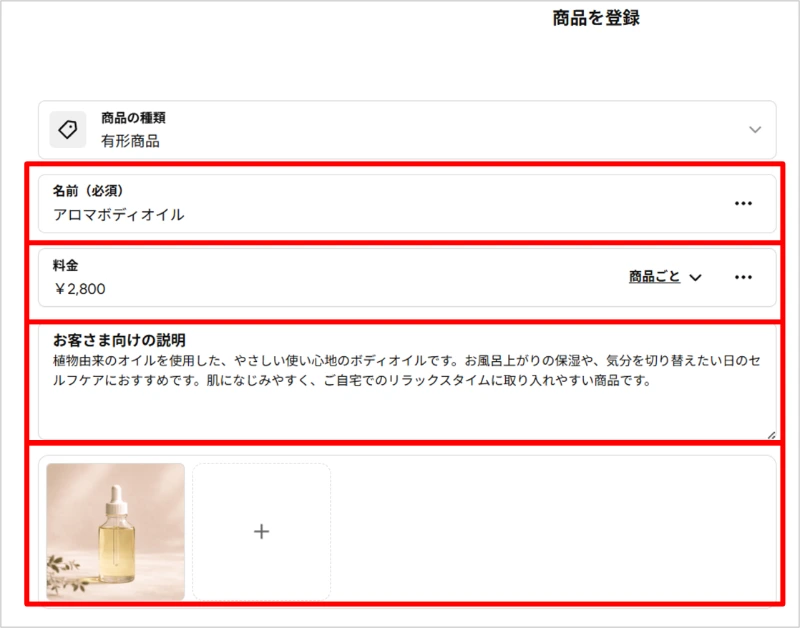 ①基本情報の入力: 商品名、価格、説明文、画像を登録します。