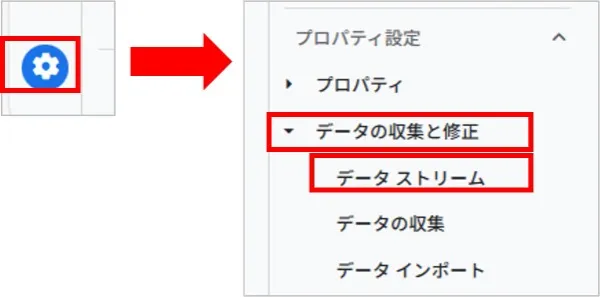 Googleアナリティクスを開き、「管理」→「データの収集と修正」→「データストリーム」の順にクリックします。