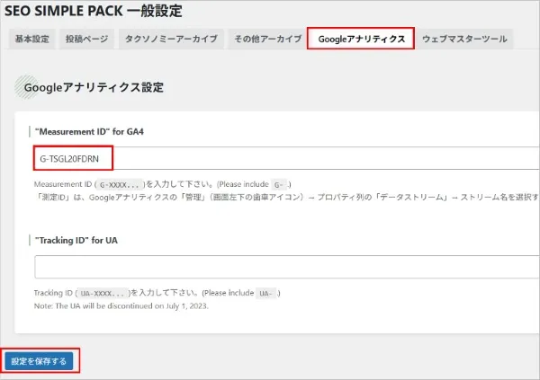 「Googleアナリティクス」タブをクリックし、「”Measurement ID” for GA4」の空欄に、コピーしておいた「測定ID(G-〇〇)を貼り付けたら、「設定を保存する」をクリックします。