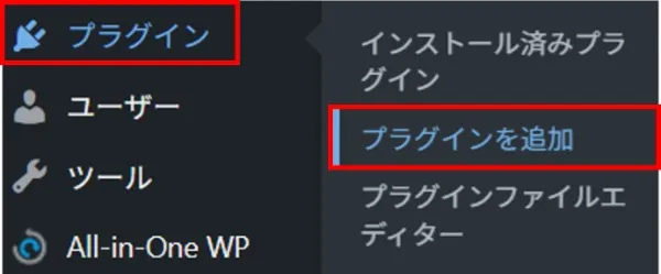 WordPressのダッシュボードで「プラグイン」→「プラグインを追加」の順にクリックします。