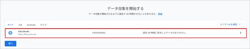 データ収集を開始する画面が表示されたら、ストリーム(対象の名前)をクリックします。