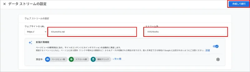 データ ストリームの設定画面が表示されるので、「ウェブサイトの URL」と「ストリーム名」を入力し、「作成して続行」をクリックします。