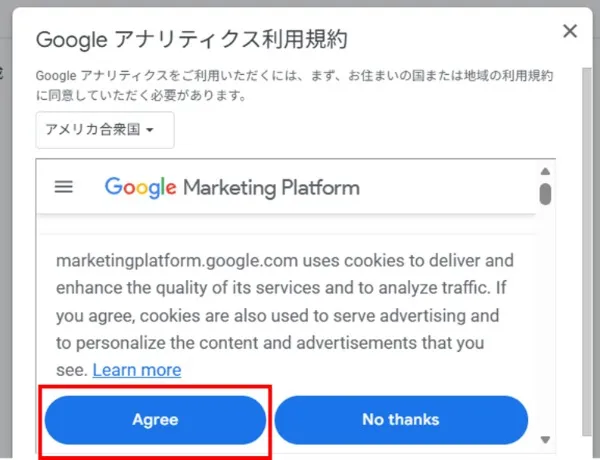 Googleアナリティクス利用規約が表示されるので、「Agree」をクリック→「日本」を選択 → 必要箇所にチェックをし、最後に「同意する」をクリックします。