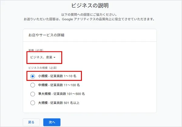 2. ビジネスの規模:わたしは「小規模」を選択しました