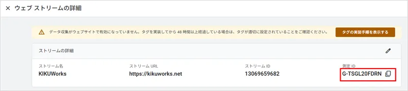 ウェブストリームの詳細画面が表示されるので「測定ID(G-〇〇)」をコピーしておきます。