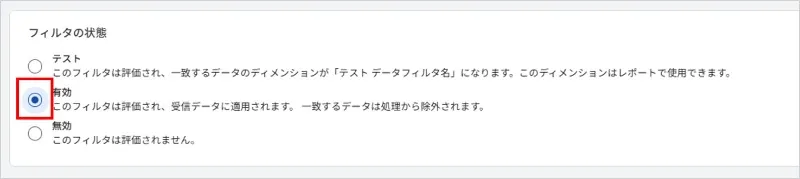 データフィルタの編集画面を下にスクロールし、フィルタの状態を「有効」にし、画面右上の「保存」をクリックします。