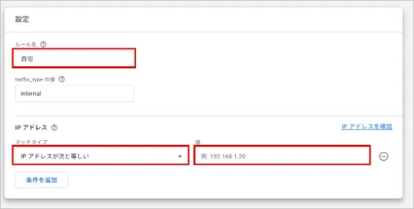 2. マッチタイプ:「IPアドレスが次と等しい」にします