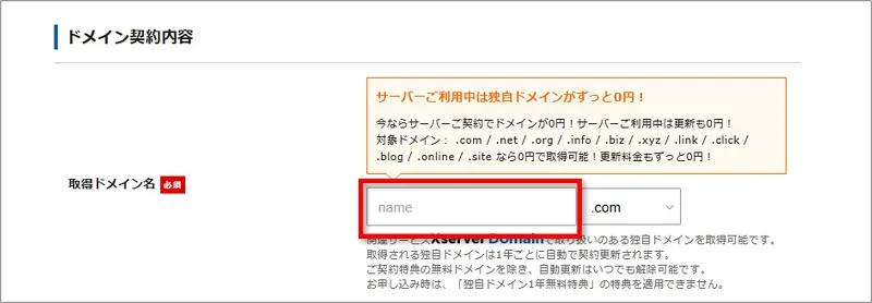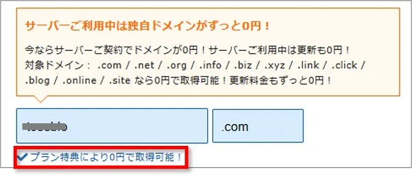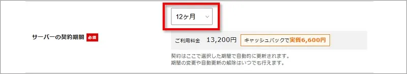 サーバーの契約期間を「12ヶ月」以上を選択し「自動更新設定」を有効にすることで、独自ドメインを永久無料で使用できます。