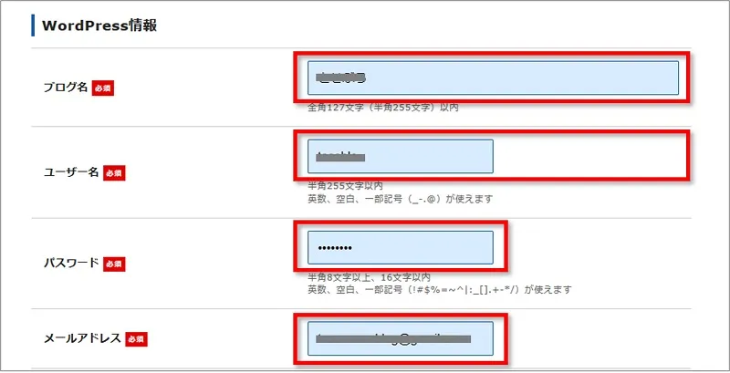 | メールアドレス | WordPress情報で入力したメールアドレスが自動入力される |