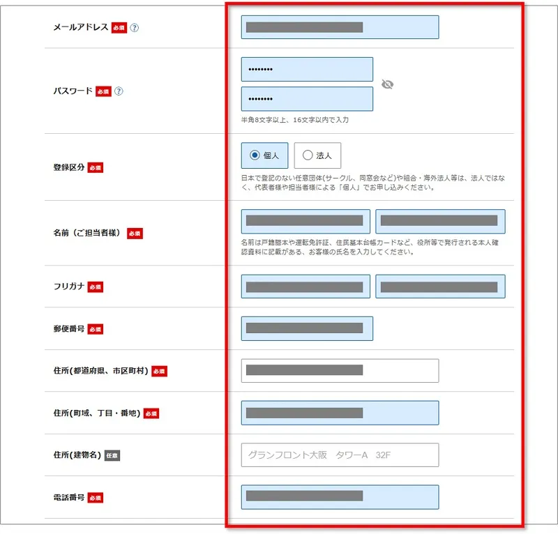「メールアドレス」「名前」「住所」などの個人情報を入力します。