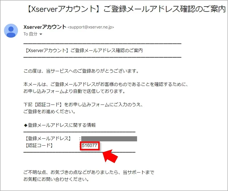 表示されたメールアドレス宛に6桁の数字だけの確認コードが送られてきます。