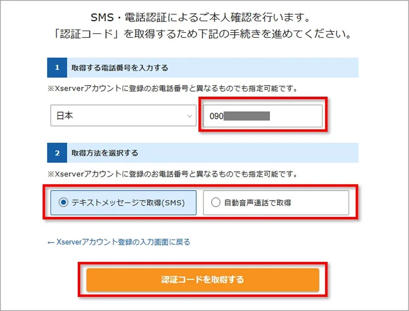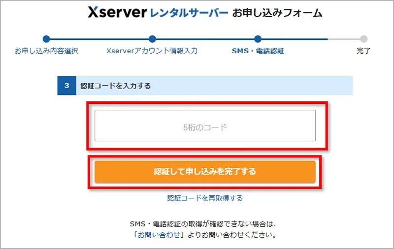 「テキストメッセージで取得(SMS)」または「自動音声」で受信した5桁の数字のみのコードを入力して「認証して申し込みを完了する」をクリックします。