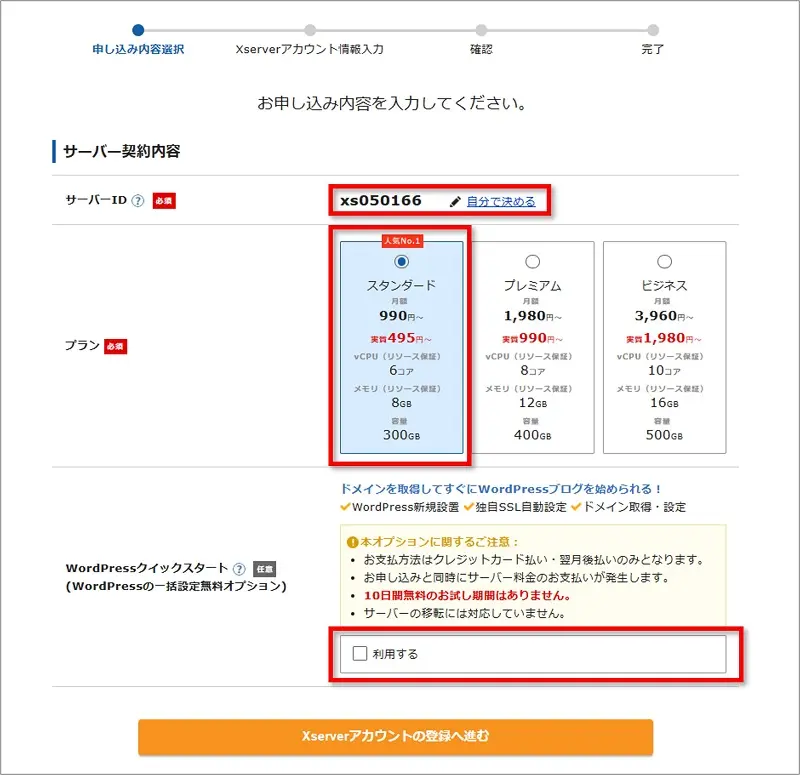 - エックスサーバーにアクセスし、WordPressクイックスタートに申し込みをする