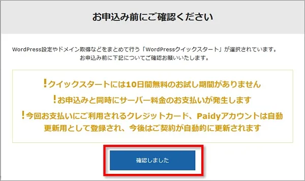 - チェックを入れると「お申込み前にご確認ください」が開くので問題がなければ「確認しました」をクリックしましょう。