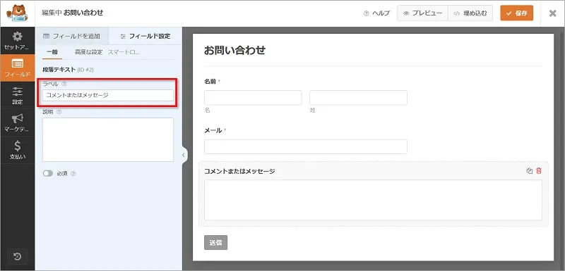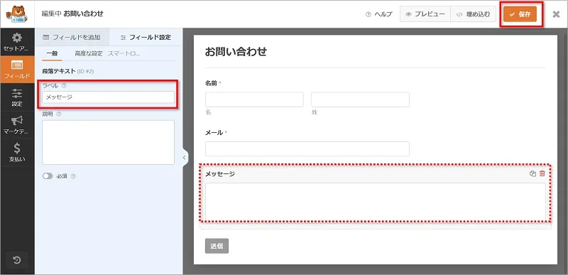 画面左フィールドの設定のラベルを、「メッセージ」と書き換え、「保存」をクリックします。