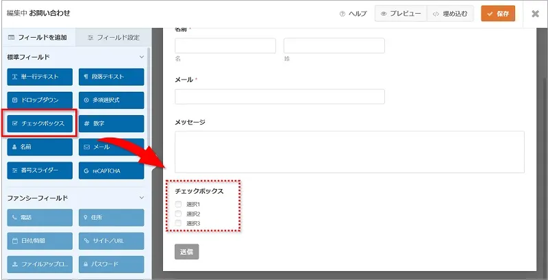 • 追加したいボタンをクリックして、お問い合わせ画面に項目を増やす