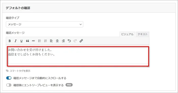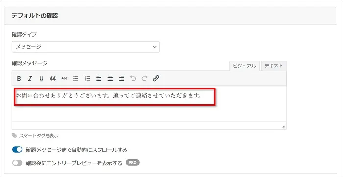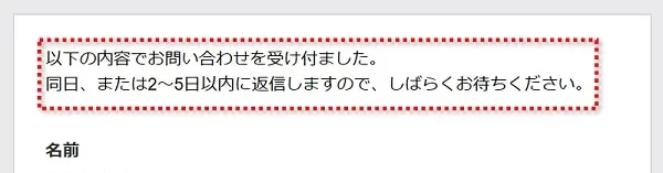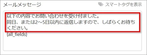 お問い合わせで送信した後に画面に表示される確認メッセージが編集できます。
