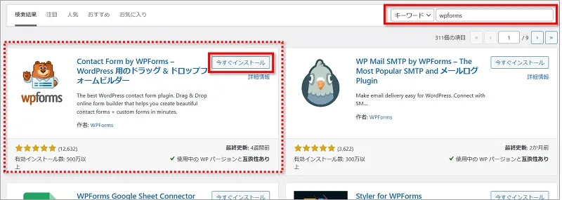 ②表示された「Contact Form byWPForms– WordPress 用のドラッグ & ドロップフォームビルダー」の「今すぐインストール」をクリックします。