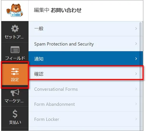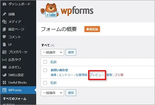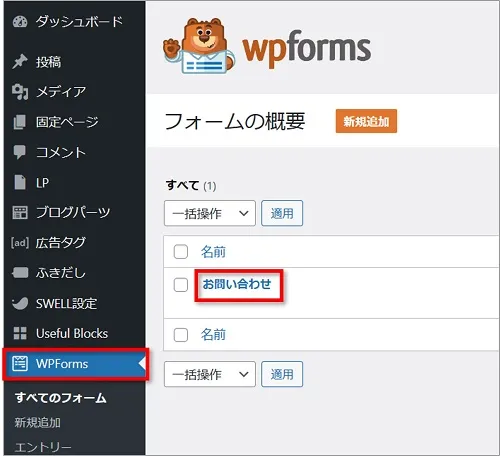 「WPForms」⇒ 「お問い合わせ」の順にクリックし、 WPForms編集画面を開きます。