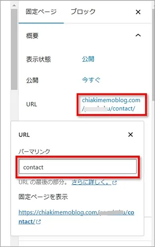 画面右のURLをクリックし、パーマリンクを「contact」と変更します。
