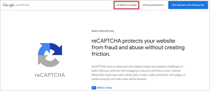reCAPTCHA」のページにアクセスし、「v3 Admin Console」をクリックします。